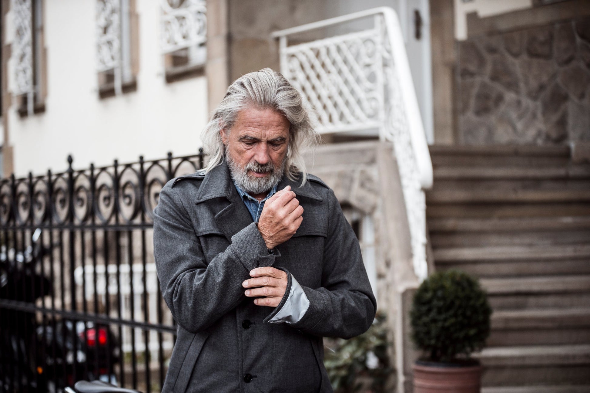 Klasický trench byl inspirací pro náš městský krátký kabát Franz. To se odráží v asymetrické ochranné přední části, která připomíná klasický dvouřadý oblek.