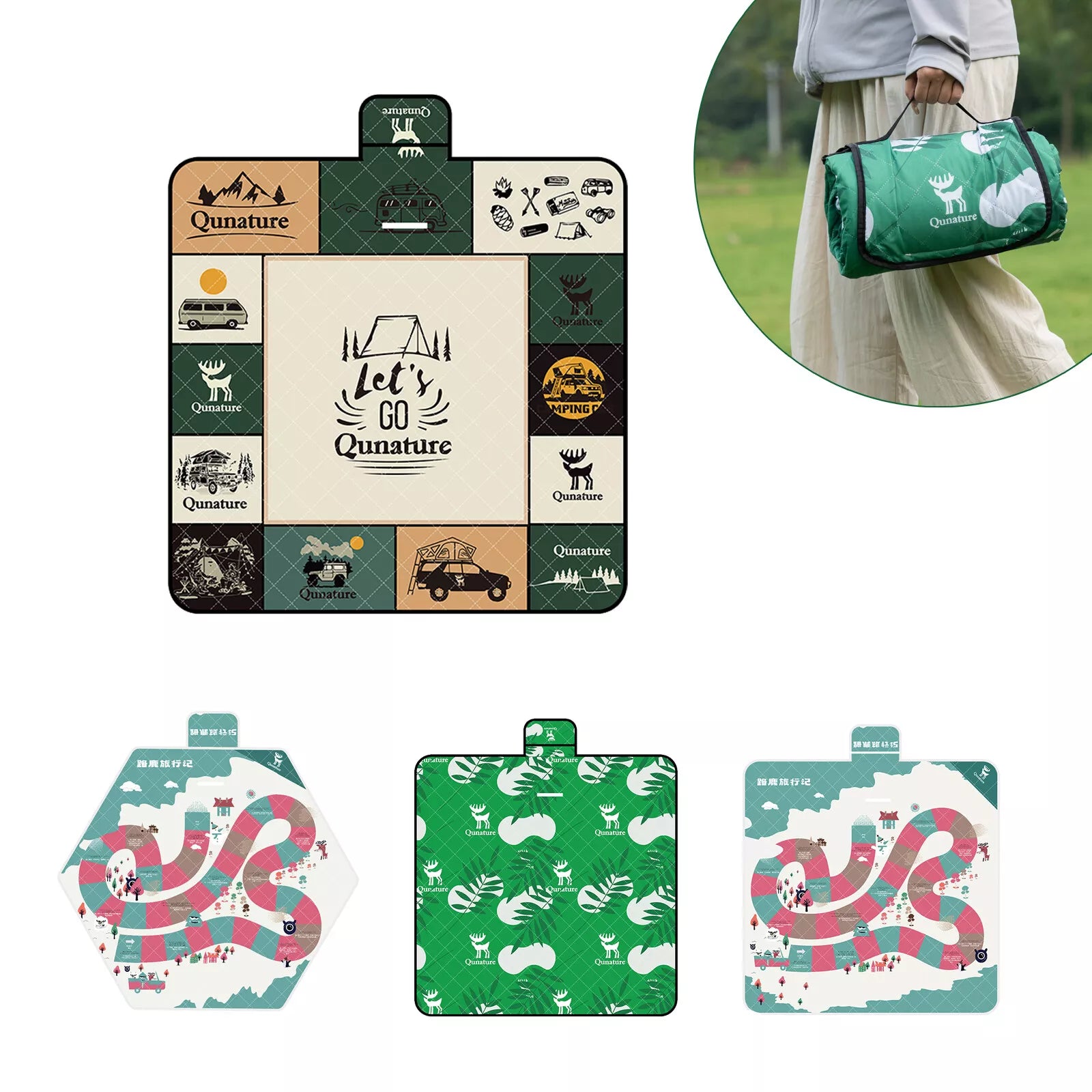 DESIGN ZÁŽITEK Z HRANÍ: Tato pikniková podložka obsahuje herní prvky a kreativní rozvržení a lze ji použít jako venkovní hřiště.