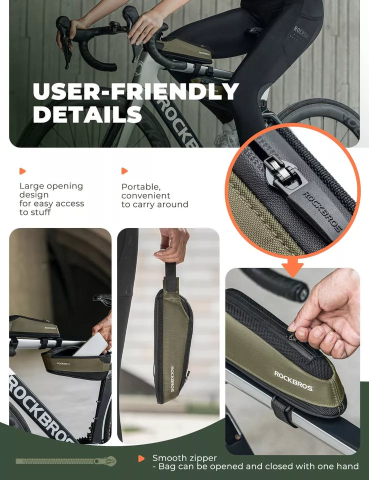 Kapacita 0,65 l a 1,4 l: Taška na horní trubku na kolo ROCKBROS s objemem 0,65 l nabízí dostatek prostoru pro drobnosti, jako jsou mobilní telefony, klíče nebo svačiny, abyste měli vše vždy po ruce. ježdění . Prostorná spodní trubka s kapacitou 1,4 l bez námahy splní vaše každodenní potřeby skladování. Díky velkému otevíracímu designu a praktickému zipu máte snadný přístup ke svým věcem.
