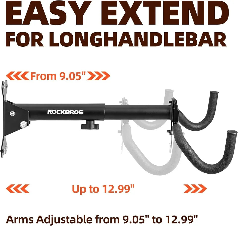 Flexibilní nastavení délky a úhlu: Přizpůsobte si své garážové nosiče kol pomocí nastavitelných ramen od 9,05 do 12,99 palce. Toto uživatelsky přívětivé nastavení, které usnadňuje otočný knoflík, umožňuje individuální přizpůsobení různým velikostem rámu kola. Nastavitelný úhel zajišťuje, že kola jsou uložena vodorovně a zároveň se přizpůsobují vaší preferované poloze, což optimalizuje prostor i estetiku ve vaší garáži nebo bytě.